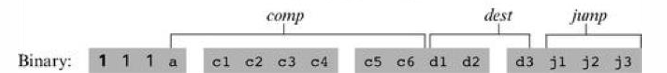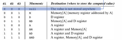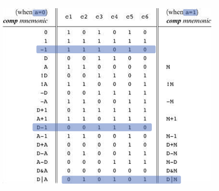 | 연산 | 0, 1, -1, D, A, !D, !A, -D, -A, D+1, A+1, D-1, A-1, D+A, D-A, A-D, D&A, D|A | M, !M, -M, M+1, M-1, D+M, D-M, M-D, D&M, D|M |