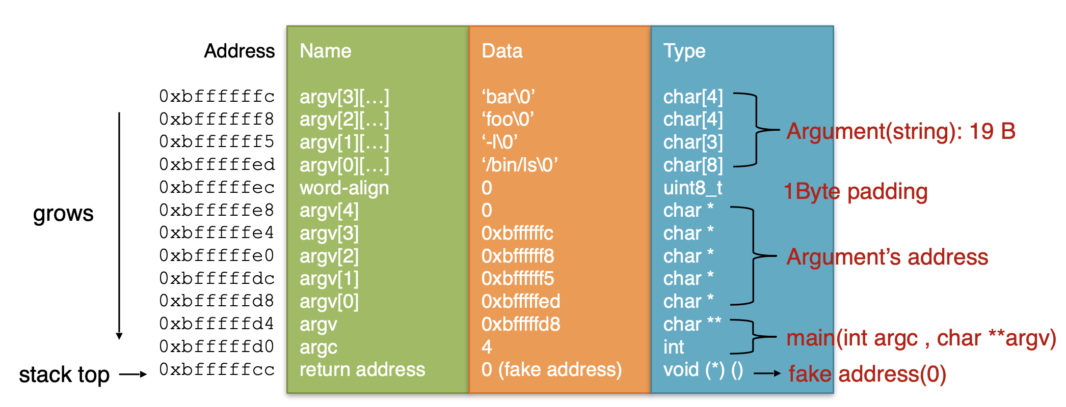 return address -> argc -> argv[] 배열 시작주소 -> word align padding - > 문자열 실제 값