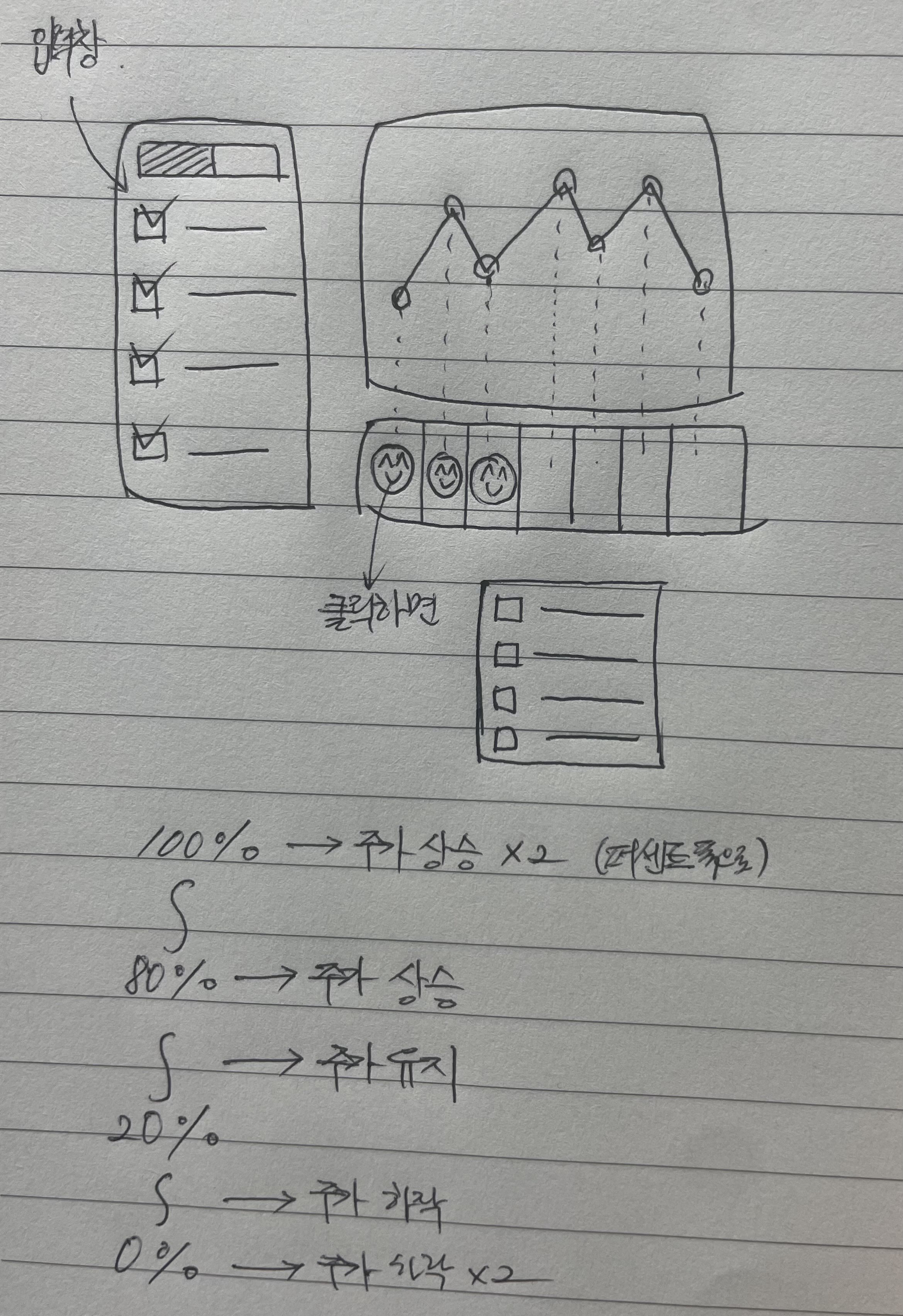 예를 들어 5명에서 스터디를 한다고 하였을 때 5명 중 4명이 계획을 지키고 1명이 계획을 지키지 않았다면 주가가 상승하고 반대로 5명 모두가 안하면 주가가 급락하는 방식으로 말이다. 공동의 목표를 가지고 함께 주가를 올리며 확인해본다면 더 재밌을 것 같다.